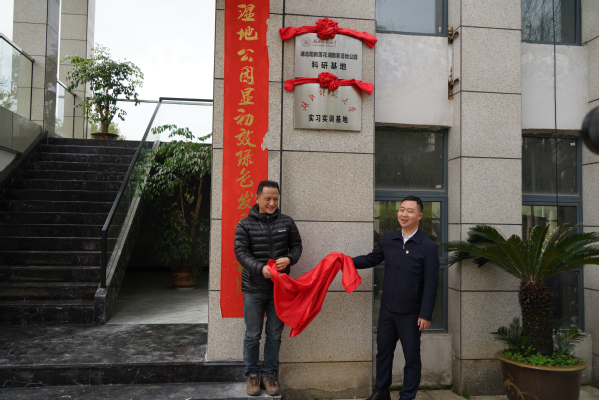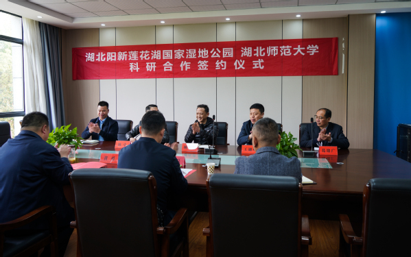 王磊首先对城市与环境学院领导的到访表示热烈欢迎。他表示,与湖北师范大学的科研合作,将为莲花湖生态修复带来新一轮宝贵契机和强有力技术支撑。会上,双方就各自基本情况、发展优势和需求进行了深入交流。双方一致认为,两者可在湖泊湿地修复与保育和人才培养等方面进行全面合作,实现优势互补、合作共赢。王湖坤与黄勇共同签订了科研合作、实习基地协议。会后,杨应华与王磊共同为湖北师范大学湖北阳新莲花湖国家湿地公园科研基地”和“湖北师范大学实习实训基地”揭牌。