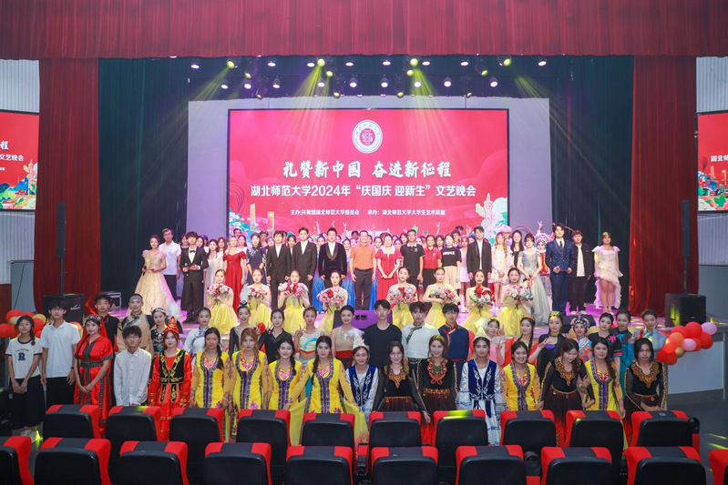 本网讯 礼赞新中国,奋进新征程。9月28日晚,由校团委主办、校大学生艺术联盟承办的2024年“庆国庆 迎新生”文艺晚会在湖师大礼堂燃情上演。