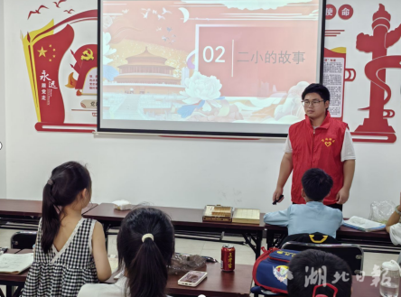 湖北日报客户端讯 7月5日下午,黄石港区万达华府暑期爱心托管班鸿骐宣讲团抗战精神宣讲活动迎来首场开讲。宣讲团成员、湖北师范大学马克思主义学院学生苏腾讲述了少年英雄王二小的动人故事。