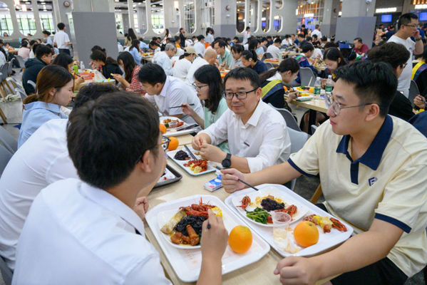 6月22日,华中农业大学校长严建兵在毕业典礼暨学位授予仪式上,邀请毕业生品鉴学校科研团队的硬核科技成果。乌黑发亮的华墨香黑米、金黄的华甜玉玉米、青翠欲滴的板蓝根油菜苔,连同“双水双绿”小龙虾、无肌间刺武昌鱼(品鉴产品)、楚乡黑猪肉、脐橙、宗橙等8项华农特色科研成果齐聚毕业生餐盘。图为华中农业大学校长严建兵与毕业生共进午餐。