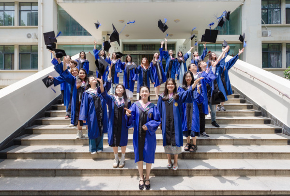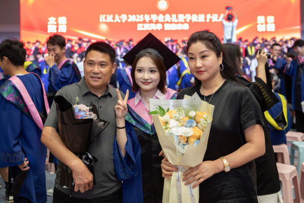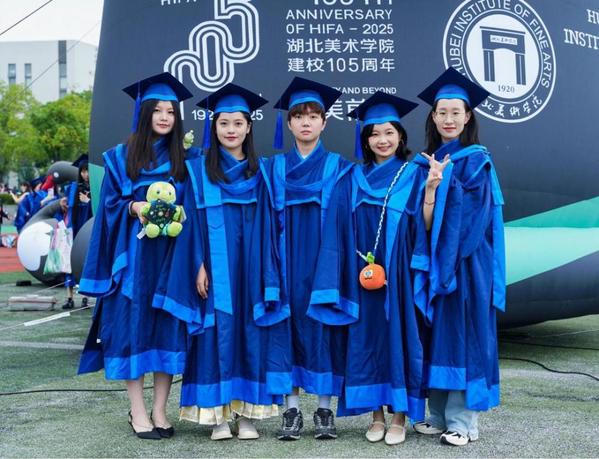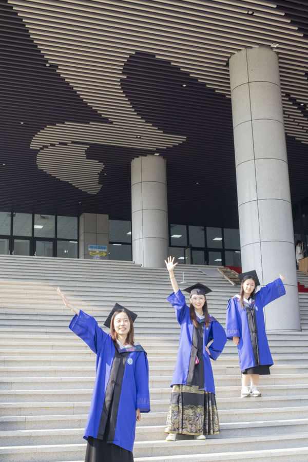 6月12日,校园建筑前的台阶上,三位身着蓝色学位服的同学,戴着学士帽,或抬手比耶,或叉腰微笑,在毕业季留下青春剪影。顶上映着武汉工程大学的校徽的线条与明亮的着装相衬,把校园里的成长与告别,定格成这鲜活的一刻,藏着对校园的不舍和对未来的期许。