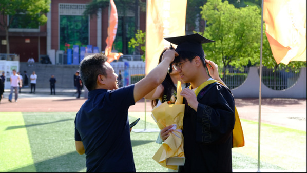 毕业典礼当天下起了大雨,老师和同学们穿着学校发的雨衣,依然风雨无阻举行典礼。校友的分享很励志、校长的讲话很鼓舞人心,88位导师走进毕业生人群中,逐一拨穗。