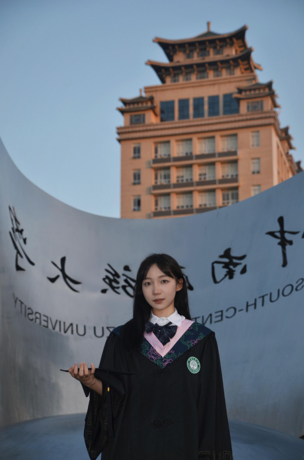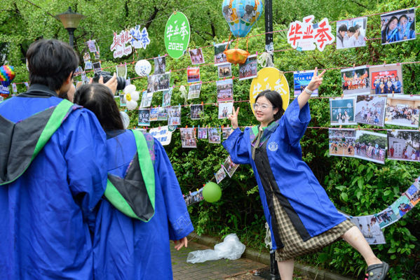 6月22日,华中农业大学在狮子山广场举行2025年毕业典礼暨学位授予仪式,为毕业生青春加冕、御风启程。学校在通往典礼的路上铺设红地毯,两旁悬挂着毕业生大学期间的照片,毕业生可以在这里合影留念。图为一名硕士毕业生在照片墙前留影。