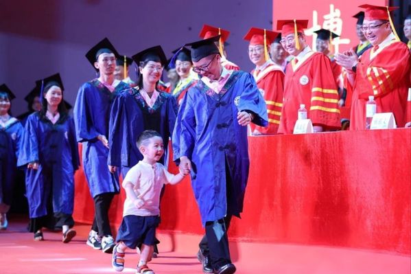 在湖北民族大学 2025 年毕业典礼暨学位授予仪式现场,红毯之上,张园身着蓝色硕士学位服,紧紧牵着儿子的小手,并肩迈向新的人生阶段。