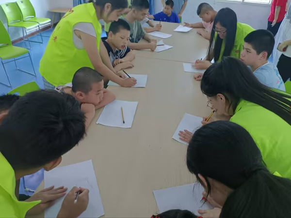 “自我介绍”课程结束后,孩子们在志愿者的带领下走进美术教室,进行绘画学习。志愿者们全程陪伴,手把手协助孩子们用画笔勾勒心中的美好图景,再用彩铅帮他们细致填色,在实践中培养孩子们的审美和创造力。