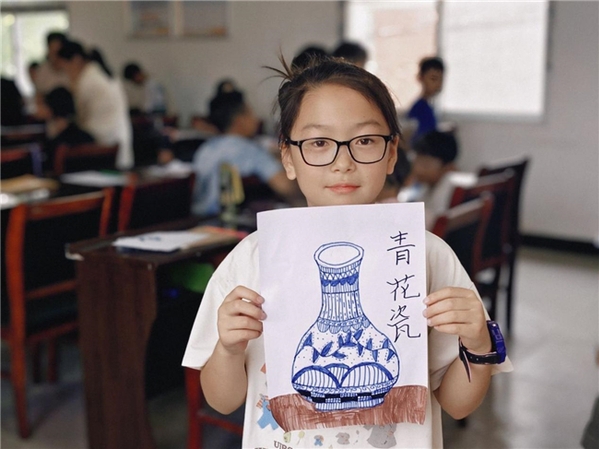 课堂上,志愿者们采用文化传承+美育实践的双线教学模式,以青花瓷文化作为载体,深入浅出地为孩子们讲解传统纹样及其蕴含的文化底蕴和美学原理,带领他们探寻中国蓝的独特魅力。在志愿者指引下,孩子们专注描摹青花纹样,亲身感受青花瓷的古典之美,在动手实践中体验非遗文化魅力,激发无限创作灵感,最终创作出独具童趣独属于孩子们自己的“青花瓷”作品。