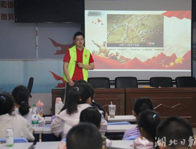 下午,来自湖北师范大学鸿骐宣讲团的志愿者邱孝龙为小朋友们带来“百团大战”专题授课。从日军“囚笼政策”的压迫,到八路军105个团主动出击的英勇,邱老师通过情境设问、阶段解析、互动探究,带孩子们回溯历史。讲破袭战“拆轨道、夜突击”,析攻坚战“拔据点、护群众”,说反击战“游击战、御扫荡”,孩子们沉浸式感受先辈们团结协作、敢打敢拼的精神。课堂上,“假如你是指挥官”的互动环节,更是激发了孩子们的思考,让他们在模拟决策中体会先辈的智慧与担当。