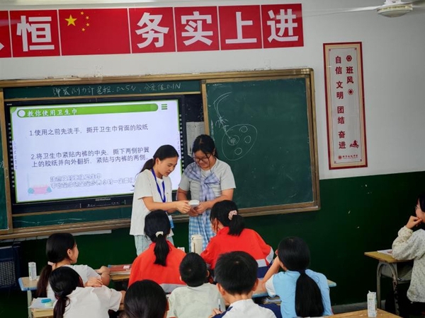 支教老师宗庭竹和学生一起演示卫生巾的正确使用方法