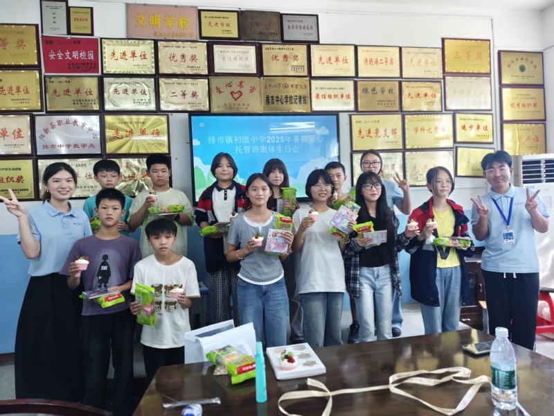 实践队为排市中学爱心托管班学子举办集体生日会。龙一涵供图