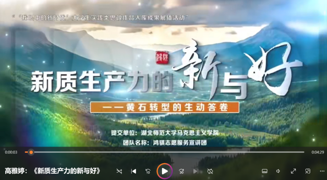 本网讯 近日,第二届“我眼中的新时代”大学生实践类思政作品入库成果展播活动评选结果公布。由我校马克思主义学院刘玲玲等老师指导,本科生高雅婷和研究生肖宏明等联合创作的作品《新质生产力的新与好——黄石转型的生动回答》,经两轮严格遴选,最终被确定为入库作品。