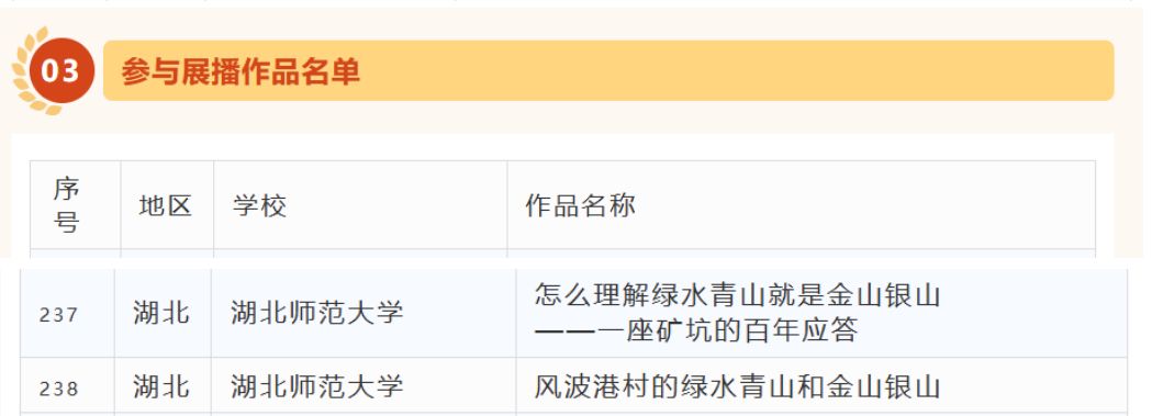 此外,由马克思主义学院高榕蔚老师指导的《怎么理解绿水青山就是金山银山--一座矿坑的百年应答》以及彭舟等老师指导的《风波港村的绿水青山和金山银山》两部作品入选参与展播作品名单,充分展示了我校推进“大思政课”实践教学改革的阶段性成效。