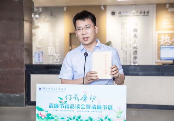 校纪委副书记、综合室主任刘刚向在场师生推荐了清廉书目,希望大家深入阅读廉洁文化经典著作,读原著、学原文、悟原理,践行廉洁文化,弘扬清风正气。图书馆馆长易桂姣向与会师生发出读书倡议:养成热爱读书的好习惯、博览群书的好习惯、善于读书的好习惯,坚持阅读,阅读清廉书籍,让读书成为校园最美的风景线。机关第八党支部、图书馆、生命科学学院、读者协会4位师生代表分别上台发言,结合工作和学习实际,分享了清廉书籍品读心得体会。与会领导还向师生代表赠送了清廉书籍。