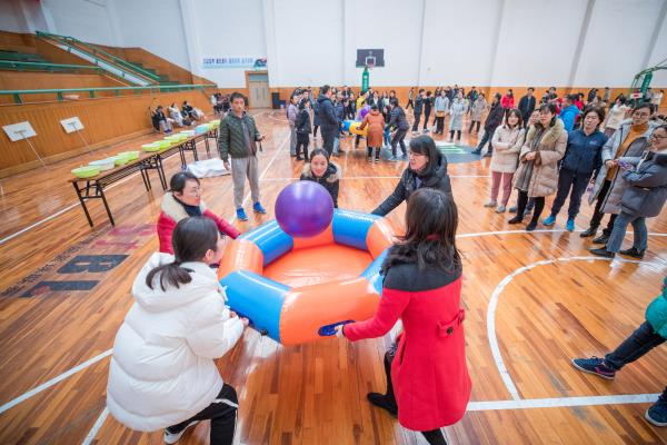 沙包投准、夹乒乓球、花球投篮;两人三足、企鹅漫步、板鞋竞速;1分钟跳绳、摸石过河、羊角球追逐;趣跑毛毛虫、共闯天涯、众星捧月、同舟共济。九项个人项目和四项团体项目在裁判员的指挥下进行得有条不紊。全校各工会小组积极响应,踊跃报名,来自各单位的近两百多名选手一同竞技比拼,赛场内激情饱满,赛场外活力四射。各种趣味十足的竞赛项目令大家放松心情,笑容满面。比赛间隙安排的背景音乐更给体育馆增添了许多动感与活力。