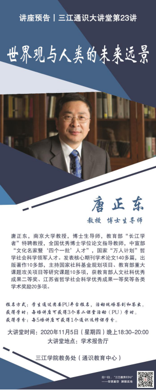 本学期通识大讲堂,我们将邀请校外通识教育领域有研究的专家们,与各位共享科学与人文、艺术与审美、经济与社会等各类通识文化,共同通过通识教育来领悟,作为应用型人才,我们未来该如何架构自己的人生。