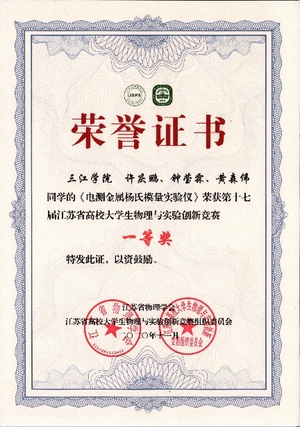 江苏省高校大学生物理与实验创新竞赛是省内公认的高水平物理竞赛,主要评选学生的创新作品,如研究论文发表和实验作品创新性及专利发明和授权。竞赛旨在促进我省高校物理及实验教学改革,激发广大学生刻苦学习、锐意进取、勇于创新的精神,全面提高学生科学素质及实践能力。