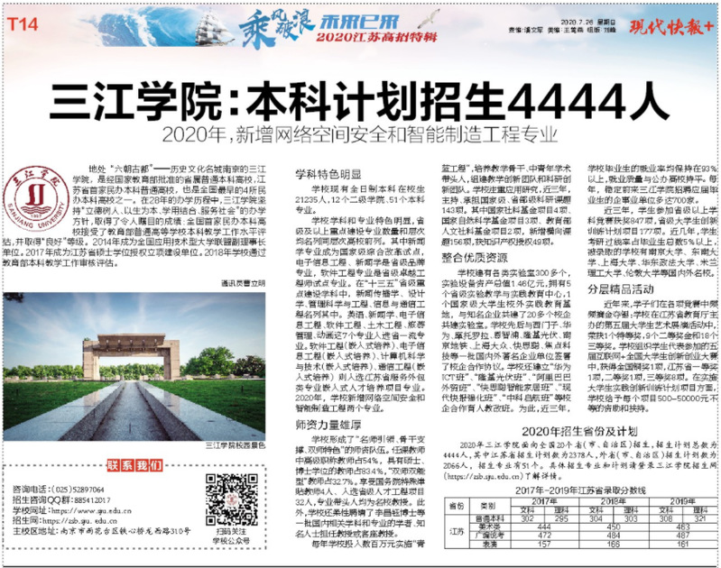 学校强化“通识教育”和“职业教育”,专门从清华、复旦、南大聘请了3名学术造诣高的文科资深教授和校内知名教授组成通识教育专家委员会,架构通识课程体系。从2019年下半年至今,学校先后聘请包括复旦、南大、南师大等高校的近30名校内外知名教授进校为学生开设“三江通识大讲堂”,迄今已有20000多名学生通过大讲堂获得思维方式和方法技能的启迪。