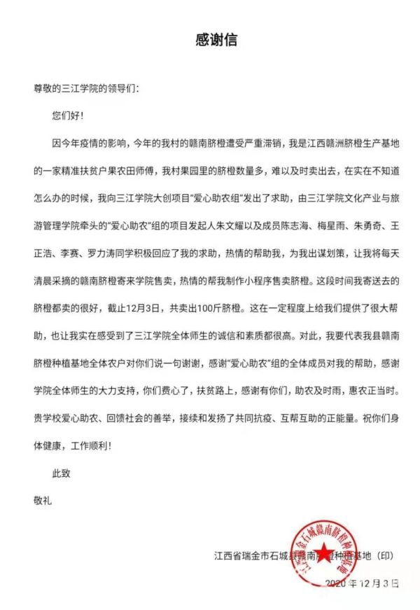6位成员每天送货到宿舍,打包、分装、贴标签,一气呵成。每天还会有线上售卖群,也会安排固定的人员在群里值班,进行收钱售后等服务。爱心助农小组的辛苦付出,也得到了合作商户的一致认可,12月,果农寄来了感谢信和一面锦旗。