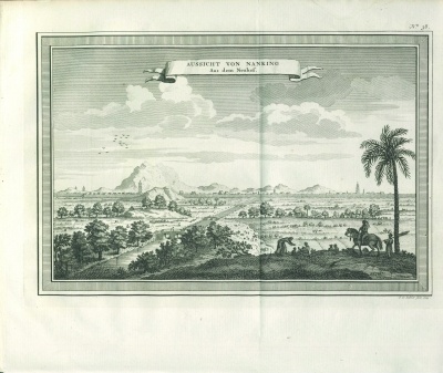 这个使团1655年8月10日到达中国,一路经过广州等许多大城市。在1656年五六月份期间,使团到达了江苏南京。南京的繁华令约翰·尼霍夫非常震惊,于是,他在南京画了大约三十多幅画。然后使团去了北京,到达北京不久后,他便又要求回到南京。这一次他从南京水西门进入,进城的时候又受到极大的震撼。相关资料记载,约翰·尼霍夫像《红楼梦》中的刘姥姥第一次进大观园一样,对身边的一切都感到非常好奇。他拿起随身携带的画笔,走到哪里就画到哪里,他的观察十分仔细,在南京画了很多幅画,详细记录当时南京城内建筑以及市民生活状况。
