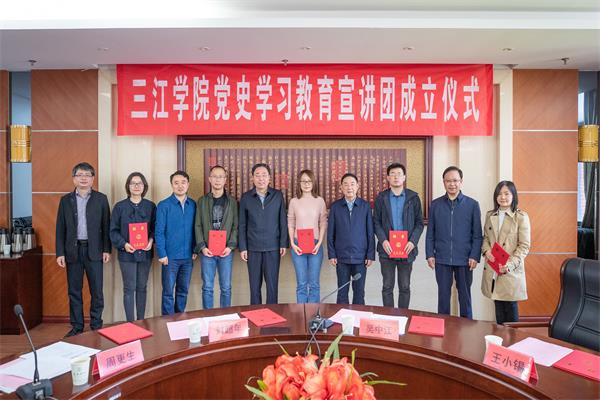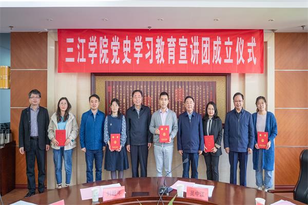 吴中江宣读了《关于成立三江学院党史学习教育宣讲团的通知》,与会校领导为宣讲团成员颁发聘书。