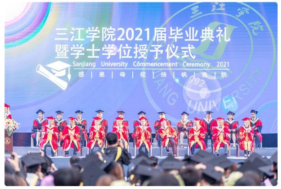 2017 年夏,有一群稚气未脱的少年仰望着三江牌楼,大学生活就这样开始了。2021 年夏,还是这一群少年,他们穿着学士服,向初来三江迎接他们的三江牌楼告别。大学四年就这样匆匆而过,在离别之际,学校精心为他们准备了仪式感满满的毕业典礼!6 月 10 日 18:00 起,三江学院校园内,全体 2021 届毕业生和老师及家长代表一起,共同度过了一个难忘的夜晚。他们共同见证了 2021 届毕业典礼暨学士学位授予仪式 ,也收到了一份珍贵而难忘的 红色礼物 。主题为《百年辉煌正青春》的 三江学院庆祝中国共产党成立 100 周年艺术党课 燃爆现场。三江人用艺术的手法讲党史,用戏剧的形式上党课,2021 届毕业生们离校前的 最后一课 显得格外有意义。
