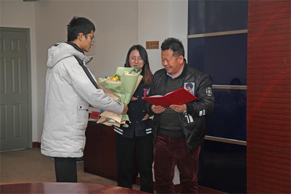 随后,各班级辅导员老师和学生代表共同为学业导师们颁发了聘书,并赠送鲜花。
