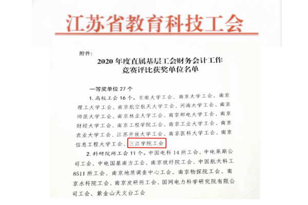 根据《直属基层工会财务工作竞赛和工作经费补助暂行办法》规定,综合各单位平时财务工作以及2020年度财务互查情况。经评比,三江学院工会等16所高校工会荣获一等奖,为学校争得了荣誉。