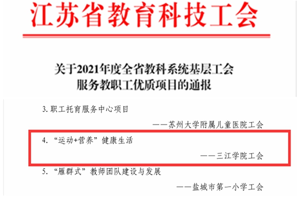 我校工会和体育部联合申报的项目《“运动+营养”健康生活》被江苏省教育科技工会评为优质服务项目三等奖和最受教职工欢迎的服务项目。该项目是校工会和体育部联合开展的“科学膳食、运动减脂、强健体魄”活动,由体育部组织对教职工进行体成分测量与评估,根据体成分测量及健康生活调查报告给出建议,帮助教职工合理选择与搭配一日三餐,科学适度运动,养成良好的生活习惯,恢复健康体重,保持身心健康。