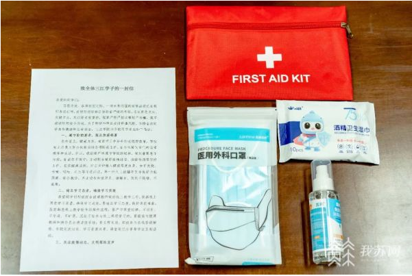 记者看到,爱心防疫包里有:75%酒精湿巾、免洗手消毒凝胶、医用外科口罩、致全体三江学子的一封信。