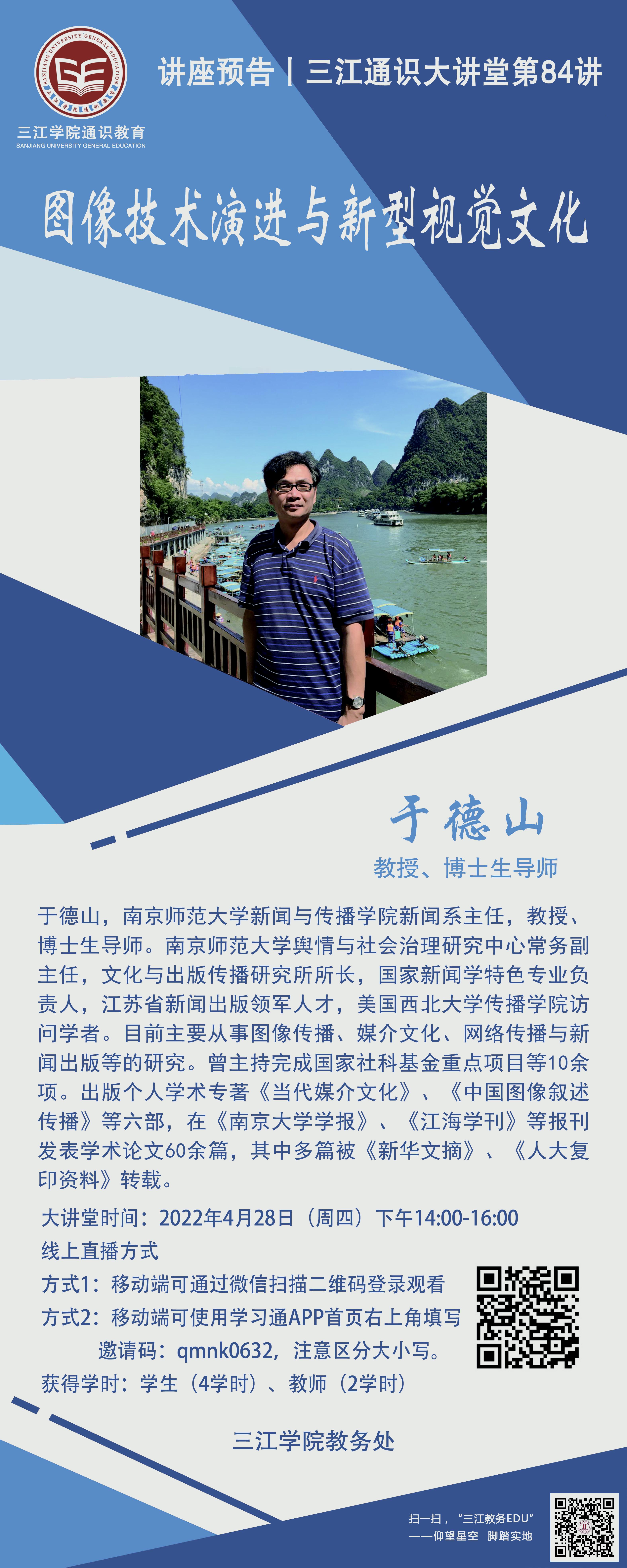 大讲堂专家:于德山,南京师范大学新闻与传播学院新闻系主任,教授、博士生导师。南京师范大学舆情与社会治理研究中心常务副主任,文化与出版传播研究所所长,国家新闻学特色专业负责人,江苏省新闻出版领军人才,美国西北大学传播学院访问学者。目前主要从事图像传播、媒介文化、网络传播与新闻出版等的研究。曾主持完成国家社科基金重点项目等10余项。出版个人学术专著《当代媒介文化》、《中国图像叙述传播》等六部,在《南京大学学报》、《江海学刊》等报刊发表学术论文60余篇,其中多篇被《新华文摘》、《人大复印资料》转载。