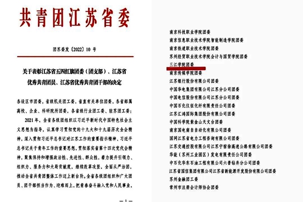 近日,共青团江苏省委下发《关于表彰江苏省五四红旗团委(团支部)、江苏省优秀共青团江苏省优秀共青团干部的决定》,我校团委荣获“江苏省五四红旗团委”称号。