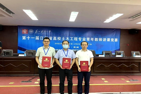 第十一届江苏省高校土木工程专业青年教师讲课竞赛于8月20日至22日在苏州举行。本次讲课竞赛由江苏省土木建筑学会教育工作委员会主办,苏州科技大学承办,我校土木工程学院院长胡夏闽,副院长侯宇颖率领三位青年教师吴嵌嵌、端传捷、李涛参加了本次比赛。经过参赛选手的激烈角逐, 均荣获讲课竞赛二等奖。