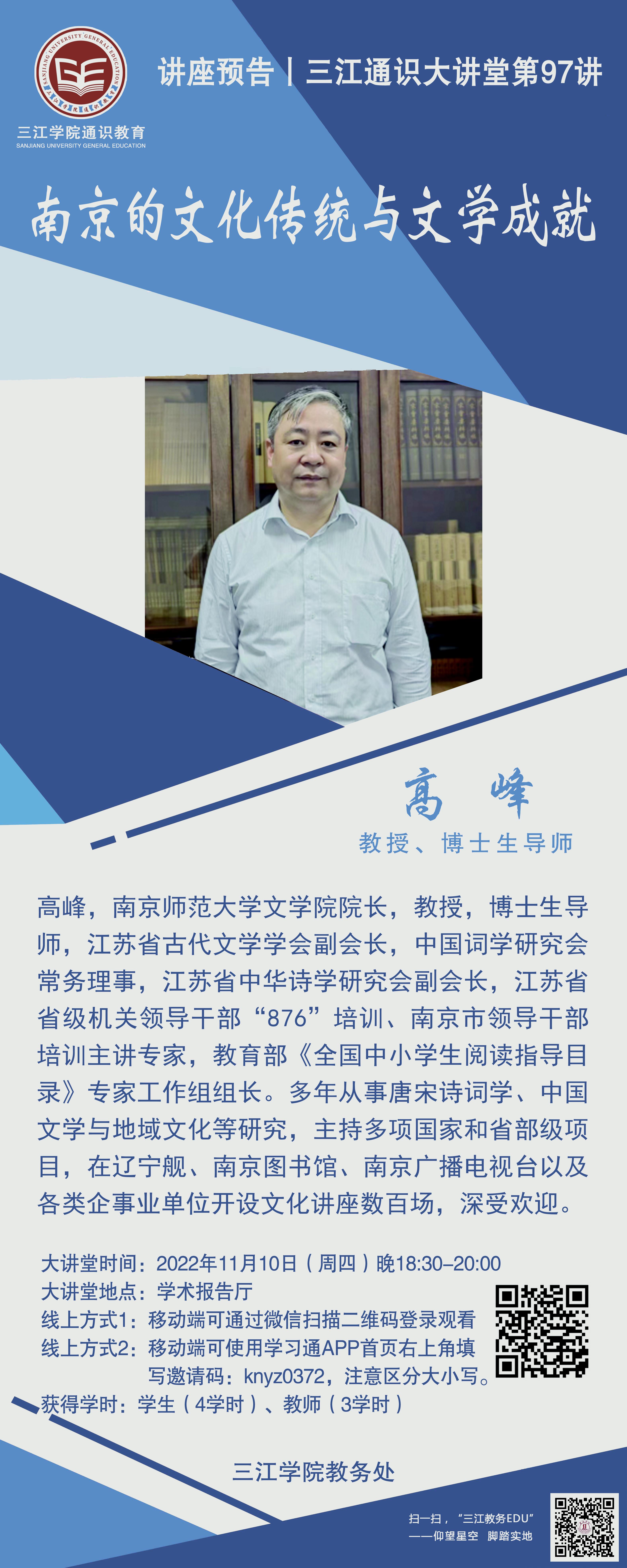 大讲堂专家:高峰,南京师范大学文学院院长,中国古代文学专业教授、博士生导师,江苏省古代文学学会副会长,中国词学研究会常务理事,江苏省中华诗学研究会副会长,江苏省省级机关领导干部“876”培训、南京市领导干部培训主讲专家,教育部《全国中小学生阅读指导目录》专家工作组组长。多年从事唐宋诗词学、中国文学与地域文化等领域的学术研究,先后主持多项国家和省部级科研项目,出版《花间词研究》《江苏词文化史论》《乱世中的优雅——南唐文学研究》《南京古代文化变迁与文学演进》等多部学术论著,在《文学评论》《文学遗产》等期刊发表一百多篇论文,获得多项省部级科研奖励。先后获得南京师范大学教书育人奖、中北奖教金教学奖一等奖等。在辽宁舰、南京图书馆、南京广播电视台以及各类企事业单位开设文化讲座数百场,深受观众热烈欢迎。