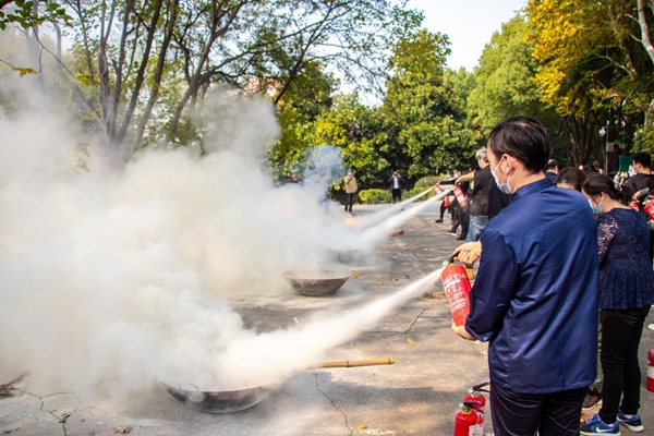 讲座结束后,全体与会人员来到停车场,朱方娇现场演示如何使用灭火器,所有人员进行了使用灭火器灭火的实战演练。