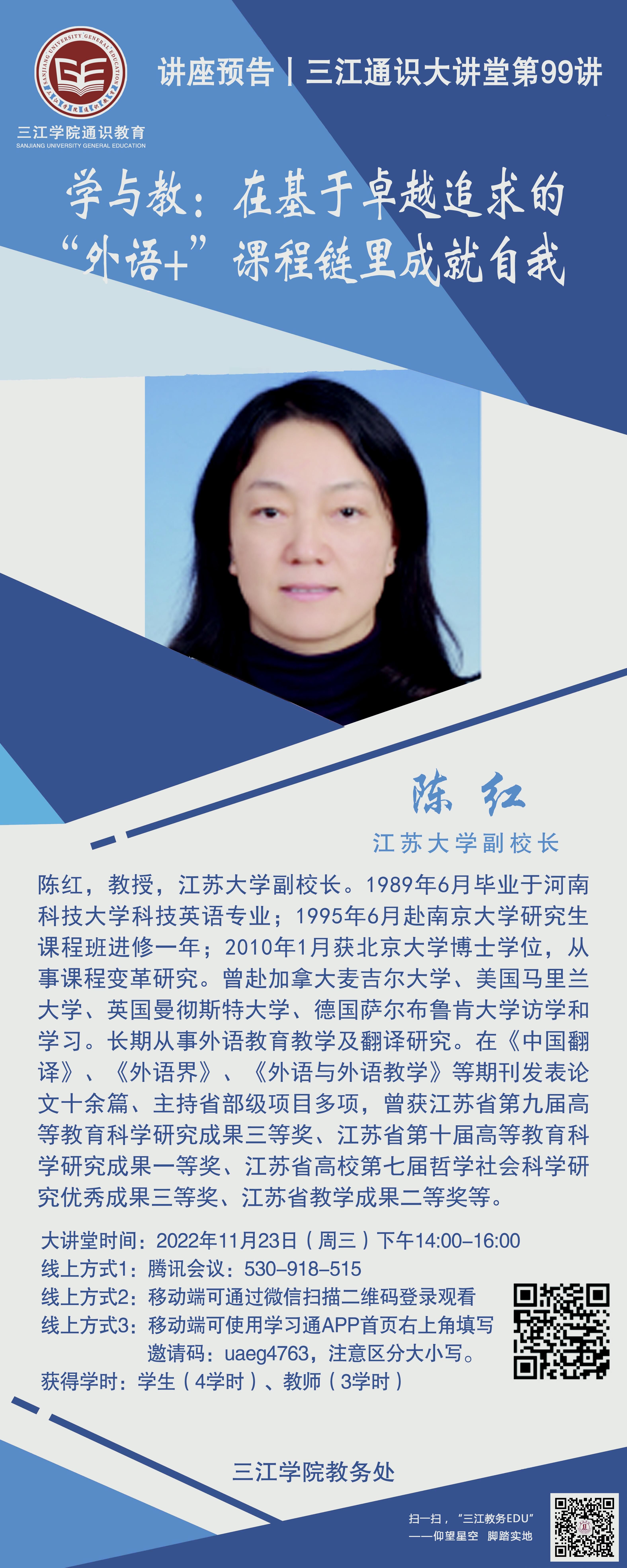 大讲堂专家:陈红,江西南昌人,博士,教授。江苏大学副校长,曾任外国语学院院长。1989年6月毕业于河南科技大学科技英语专业;1995年6月赴南京大学研究生课程班进修一年;2010年1月获北京大学博士学位,从事课程变革研究。曾赴加拿大麦吉尔大学、美国马里兰大学、英国曼彻斯特大学、德国萨尔布鲁肯大学访学和学习。长期从事外语教育教学及翻译研究。在《中国翻译》、《外语界》、《外语与外语教学》等期刊发表论文十余篇、主持省部级项目多项,曾获江苏省第九届高等教育科学研究成果三等奖、江苏省第十届高等教育科学研究成果一等奖、江苏省高校第七届哲学社会科学研究优秀成果三等奖、江苏省教学成果二等奖等。