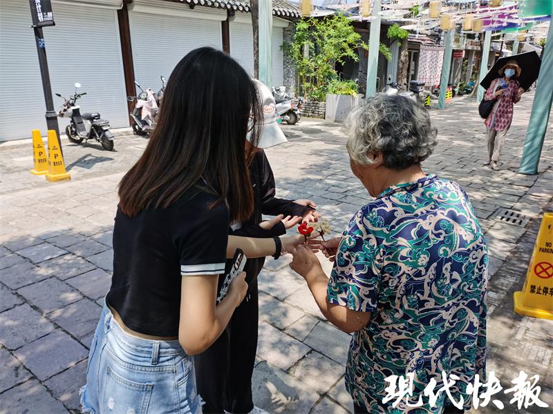 学生学习传承绒花技艺并向社区居民赠送绒花
