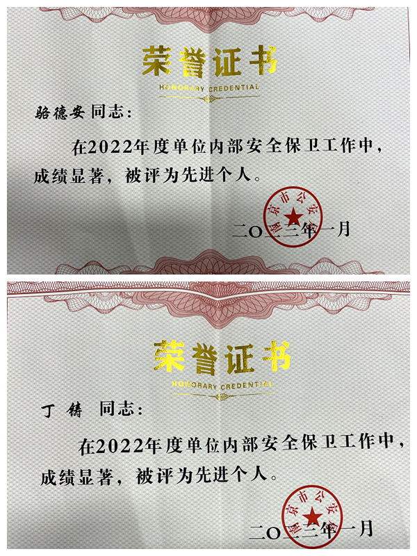 近日,南京市公安局对2022年度全市内保系统先进集体和先进个人进行表彰。我校保卫处荣获“2022年度全市内保系统保卫组织先进集体”荣誉称号;骆德安、丁铸同志被评为2022年度全市内保系统保卫组织先进个人。