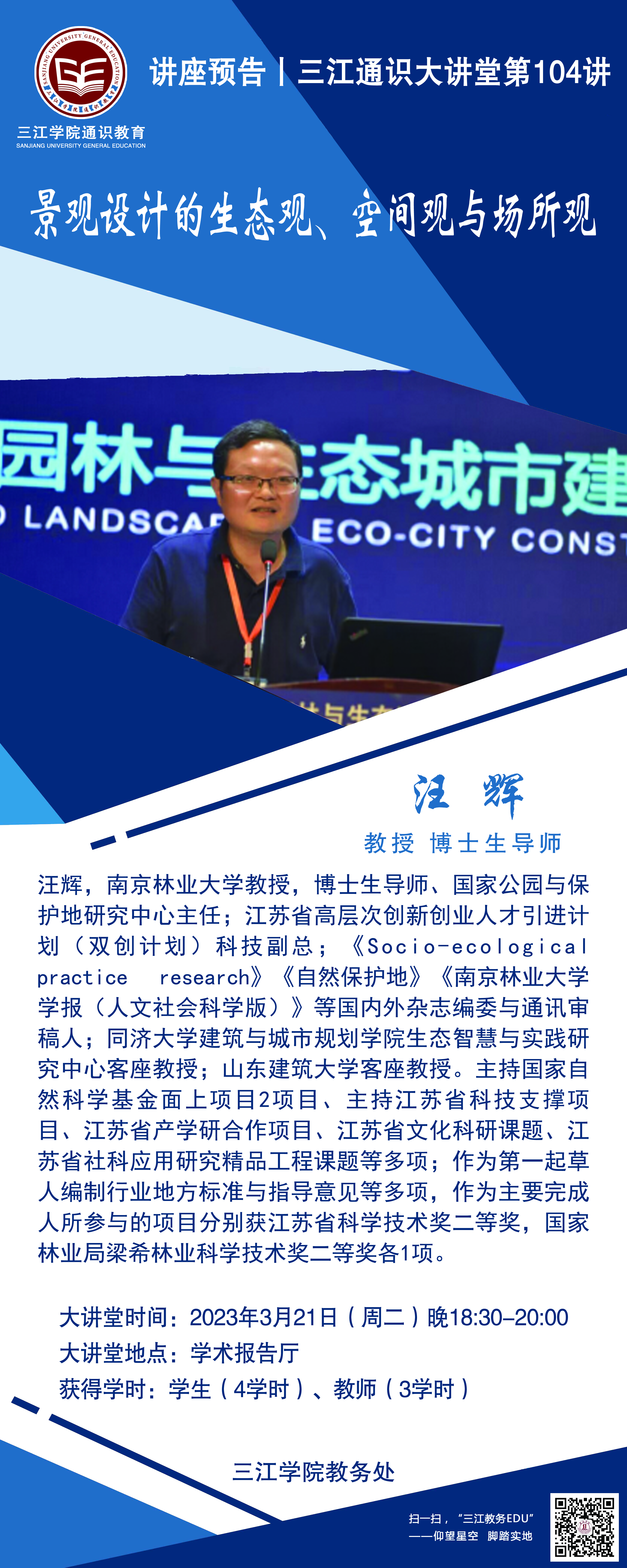大讲堂专家:南京林业大学风景园林学院教授,博士生导师、国家公园与保护地研究中心主任;江苏省高层次创新创业人才引进计划(双创计划)科技副总;《Socio-ecological practice research》《自然保护地》《南京林业大学学报(人文社会科学版)》等国内外杂志编委与通讯审稿人;同济大学建筑与城市规划学院生态智慧与实践研究中心客座教授;山东建筑大学客座教授。