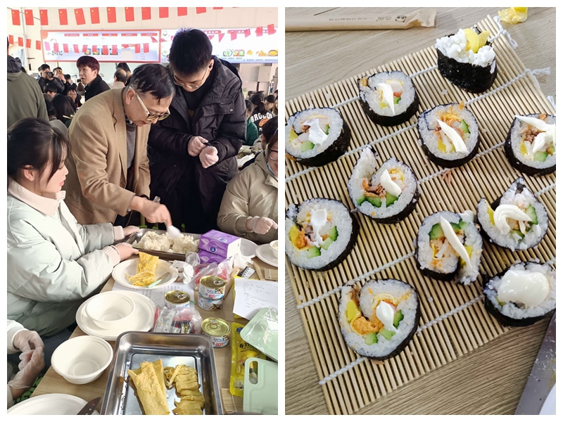 听完介绍,参与活动的同学们兴趣高涨,纷纷投入到寿司制作的实际过程中。日语系外教和全体教师也积极参与了指导和制作,同学们在老师的指导下纷纷完成了寿司制作,并兴奋地与大家分享亲手制作的成果。