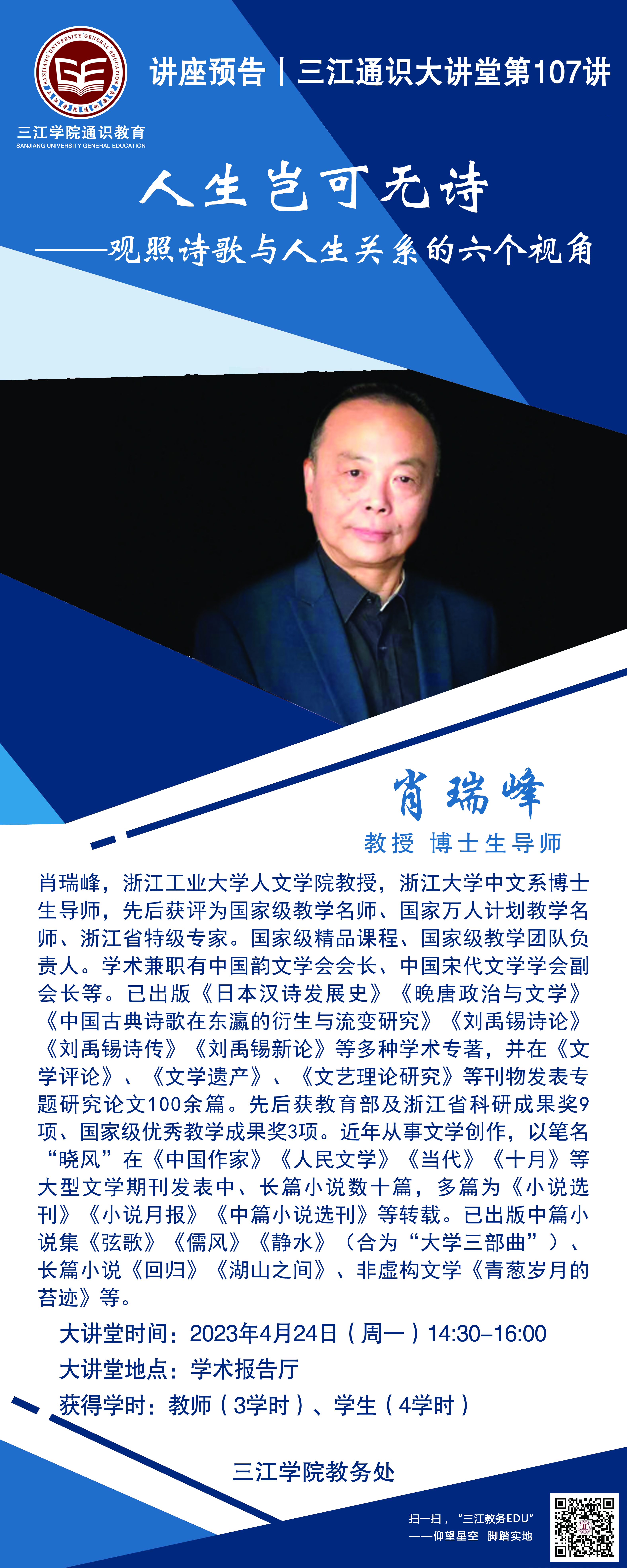 大讲堂专家:肖瑞峰,浙江工业大学人文学院教授,浙江大学中文系博士生导师,先后获评为国家级教学名师、国家万人计划教学名师、浙江省特级专家。国家级精品课程、国家级教学团队负责人。学术兼职有中国韵文学会会长、中国宋代文学学会副会长等。已出版《日本汉诗发展史》《晚唐政治与文学》《中国古典诗歌在东瀛的衍生与流变研究》《刘禹锡诗论》《刘禹锡诗传》《刘禹锡新论》等多种学术专著,并在《文学评论》、《文学遗产》、《文艺理论研究》等刊物发表专题研究论文100余篇。先后获教育部及浙江省科研成果奖9项、国家级优秀教学成果奖3项。近年从事文学创作,以笔名“晓风”在《中国作家》《人民文学》《当代》《十月》等大型文学期刊发表中、长篇小说数十篇,多篇为《小说选刊》《小说月报》《中篇小说选刊》等转载。已出版中篇小说集《弦歌》《儒风》《静水》(合为“大学三部曲”)、长篇小说《回归》《湖山之间》、非虚构文学《青葱岁月的苔迹》等。