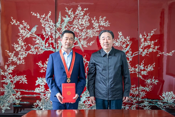封超年祝贺郁政宏老师获得“江苏省五一劳动奖章”并颁发奖牌和奖状。希望他珍惜荣誉、再接再厉,用干劲、闯劲、钻劲继续开展工作。