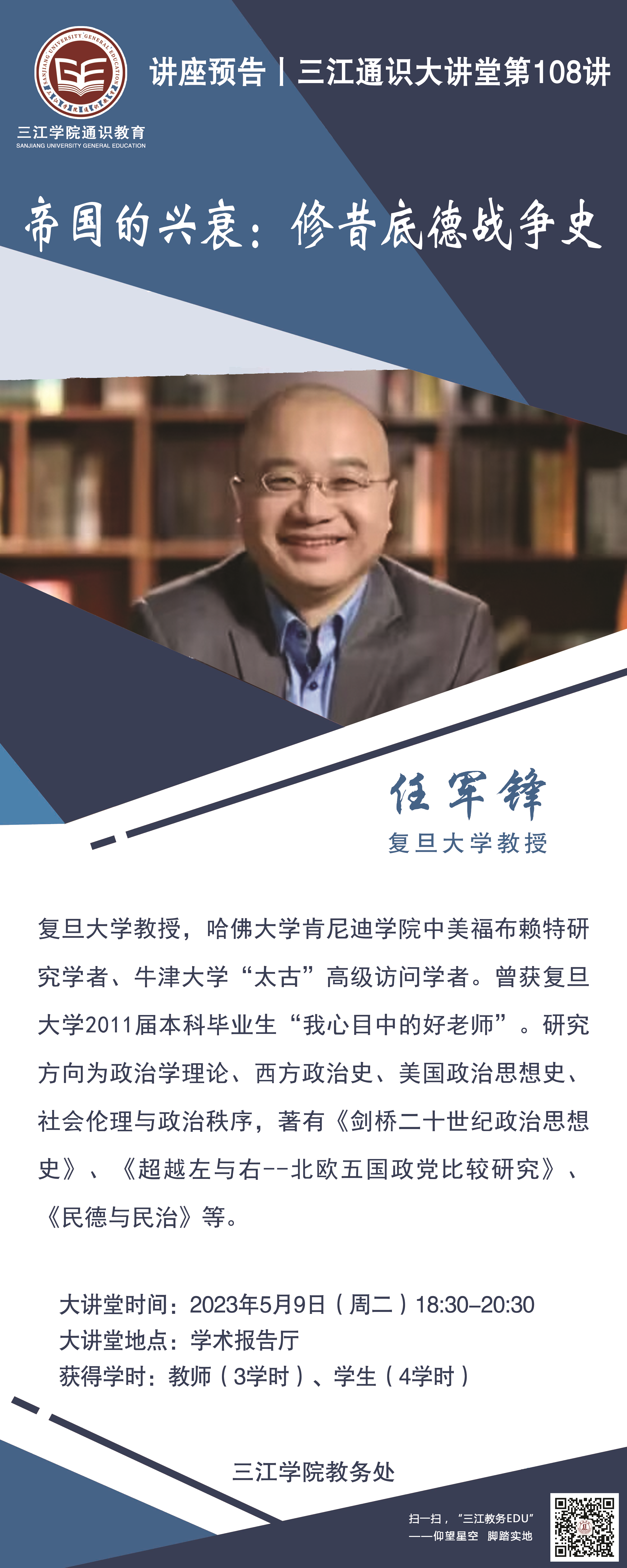 大讲座报名方式:(1)手机端:超星学习通—点击上方首页-选择三江学院(通识教育平台)——选择通识活动——选择讲座活动——选择三江通识大讲堂第108讲——点击“报名参与”;(2)电脑端:打开链接https://sjuts.mh.chaoxing.com/——下拉到通识活动——选择讲座活动——选择三江通识大讲堂第108讲——点击“报名参与”。