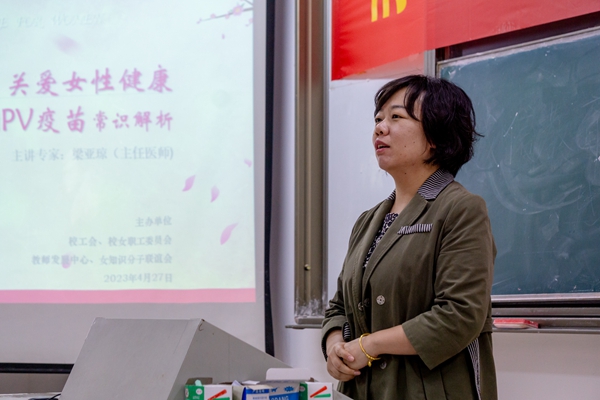 为学习宣传贯彻党的二十大精神,进一步提高我校女教职工健康意识和对HPV疫苗的认识,4月27日下午,由校工会、女职工委员会、教师发展中心、女知识分子联谊会共同组织的“关爱女性健康及HPV疫苗常识解析”专题讲座在3209教室举行。校工会主席杨业琴,副主席肖苏,教师发展中心副主任武艳,女知识分子联谊会会长、计算机科学与工程学院院长刘亚军及工会委员出席讲座。此次讲座特邀南京市疾控中心免疫规划科科长梁亚琼主任医师来校科普授课,讲座由校女职工委员会主任焦自云主持。