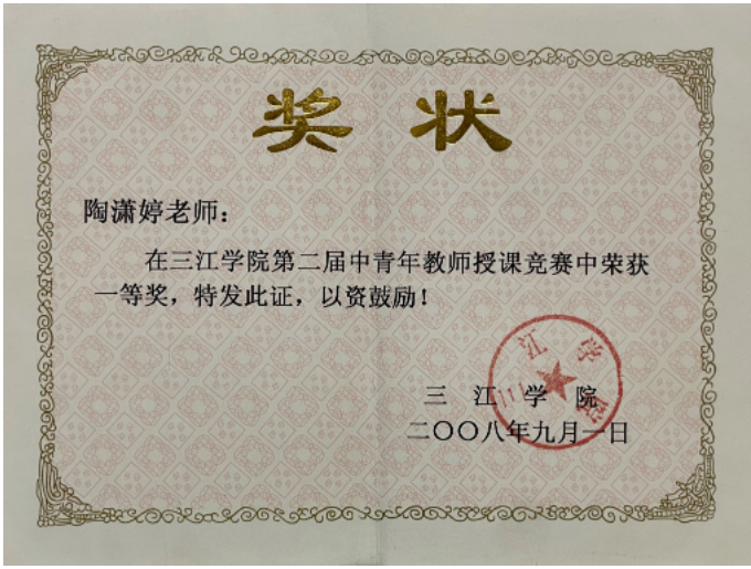 在陶潇婷老师看来,比赛实际上是一个机会。第一,能够借助这次机会全面地梳理自己的教学。日常的教学反思仅仅是侧重于某一个方面,而在比赛过程中可以更全面地梳理自己的教学内容和教学方式。第二,能够与来自省内的兄弟院校,甚至更高水准的院校的老师进行深入的沟通交流学习。包括在决赛现场答辩的过程中,专家提的意见给课程的教学带来的是帮助、是提升、是启发。在陶潇婷老师职业生涯中,参加了多次比赛并取得了全国一等奖和省一等奖的好成绩,她认为,通过比赛能够更直观地反思教学,促使自己去更多地改进自己的教学。教学比赛是一个很好的反思的机会,同时也是督促自己不断进步的一个压力。