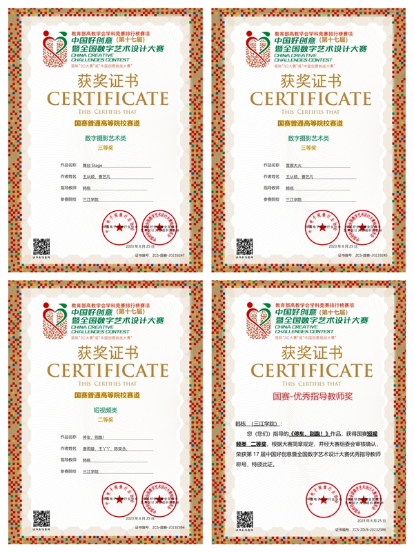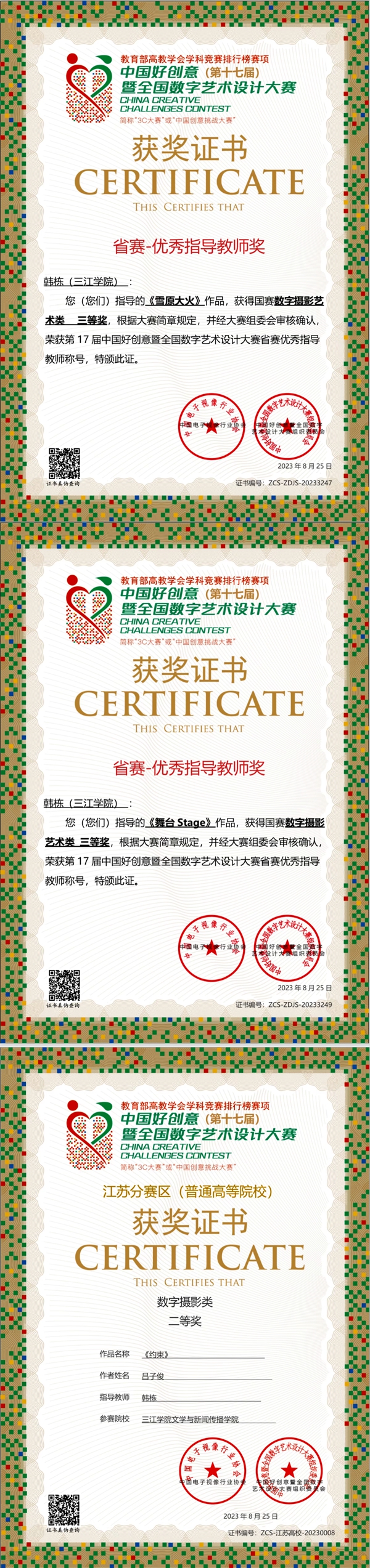 近日,第17 届中国好创意暨全国数字艺术设计大赛获奖名单正式公布。经过省赛、国赛层层选拔,我校文学与新闻传播学院韩栋老师指导学生作品喜获全国二等奖1项,全国三等奖2项,江苏省赛区二等奖1项。据悉,本次大赛共有1300多所院校参与角逐,参赛作品多达七万多件。