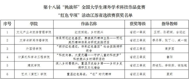 近日,共青团江苏省委对第十八届“挑战杯”全国大学生课外学术科技作品竞赛“红色专项”活动江苏省选拔赛获奖情况进行公示,经学校推荐、资格审查、专家评审、线上答辩这四个环节,我校获得一等奖1项、三等奖5项,在获奖层次上取得新突破。
