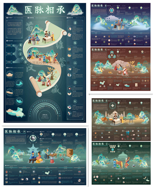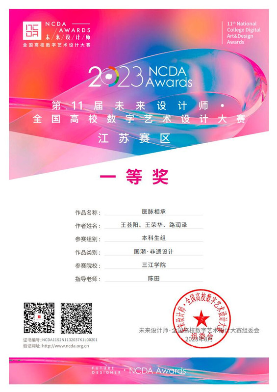 近日,第11届未来设计师·全国高校数字艺术设计大赛(NCDA)获奖名单公布,我校艺术学院视觉传达设计专业路润泽、王荟阳、王荣华三名同学在陈田老师的指导带领下,凭借作品《医脉相承》在全国高校近30万幅作品中脱颖而出,荣获本次数字艺术设计大赛国家级二等奖(同时为省级赛一等奖)。