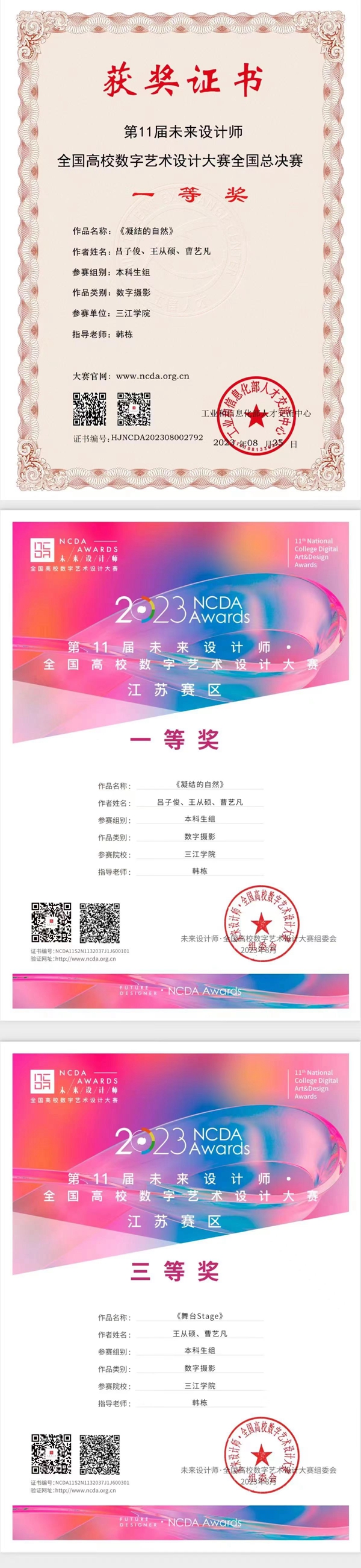 近日,第11届未来设计师·全国高校数字艺术设计大赛(NCDA)获奖名单公布,我校文学与新闻传播学院韩栋老师指导的吕子俊、王从硕、曹艺凡三位同学创作的《凝结的自然》摄影作品,在全国高校近30万幅作品中脱颖而出,荣获本次数字艺术设计大赛国家级一等奖,江苏省赛区一等奖和三等奖,韩栋老师被大赛主办方授予全国优秀指导教师奖、江苏省赛区优秀指导教师奖。