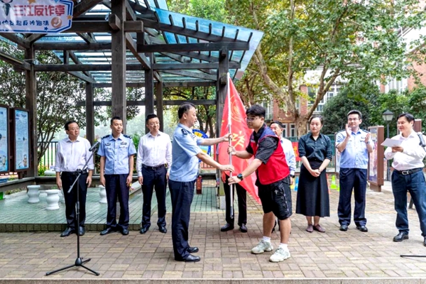 秦雪峰为三江学院反诈宣传员队伍授旗。现场反诈宣传员穿着鲜红的马甲与以蓝色为主调的主题公园相衬,为仪式现场再添一分青春热情。