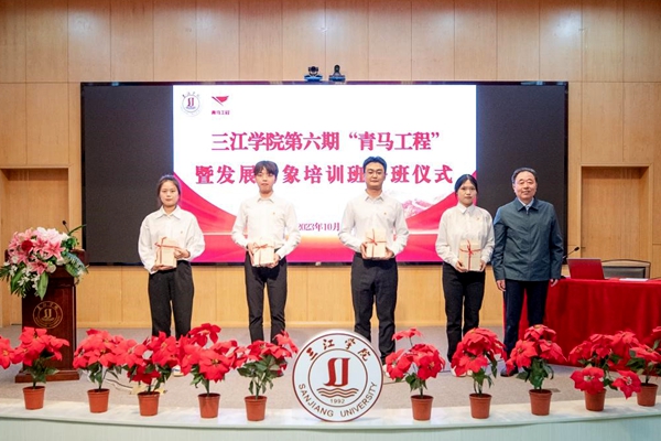 仪式在庄严的国歌声中拉开序幕,封超年为第六期学员代表赠送了书籍《习近平著作选读》、《习近平新时代中国特色社会主义思想专题摘编》和《论党的青年工作》。他希望各位同学坚持读原著学原文悟原理,用党的创新理论武装头脑、指导实践、推动工作。党委组织部、校团委负责同志宣读了《关于成立三江学院第六期“青马工程”暨发展对象培训班临时团支部的通知》,并为第五期优秀学员代表颁发结业证书。