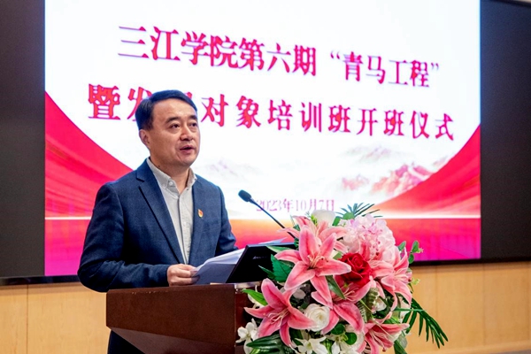 10月7日,三江学院第六期“青马工程”暨发展对象培训班在学术报告厅顺利开班。校党委书记封超年参加了开班仪式,并为第六期青马学员讲授了第一课——《筑牢新时代青年理想信念之基,谱写绚丽青春华章》。校党委常务副书记、副校长、党校校长周更生主持开班仪式。党委办公室、党委组织部、校团委主要负责同志、第六期“青马工程”培训班全体学员及第五期学员代表参加了开班仪式和培训。